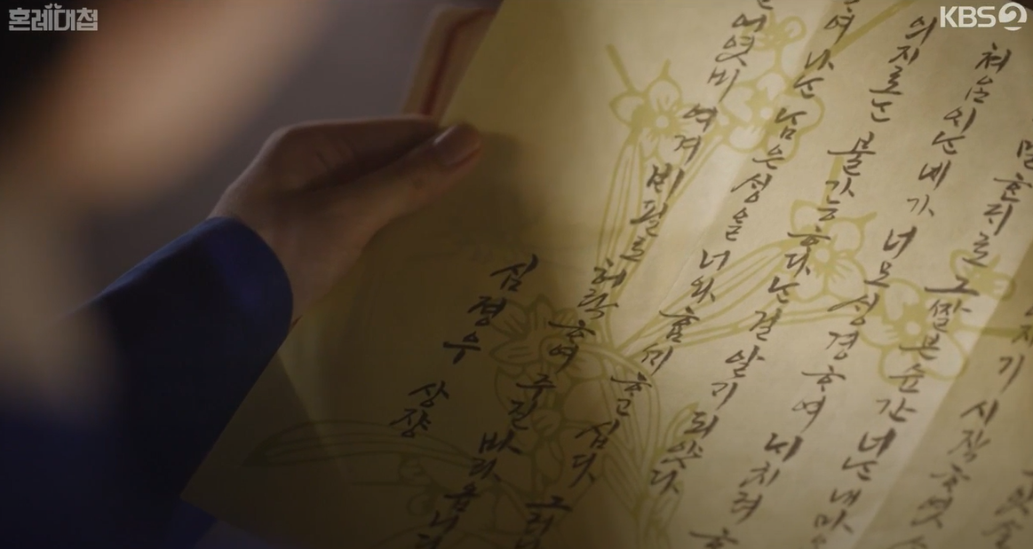 정우를 기다리면서, 정우가 건내준 양반족보안에서 순덕은 청혼서를 발견하고 읽습니다.