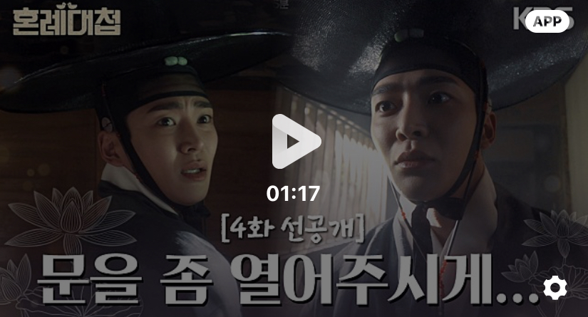 기본정보 제목 채널정보 몇부작 시청율 장르 혼례대첩 KBS2 월화드라마 (21:45~ ) 16부작 4.5 가상역사극, 로맨틱 코미디 등장인물 심정우 (로운) 정순덕 (조이현) 부마* (임금의 사위를 일컫는 호칭)