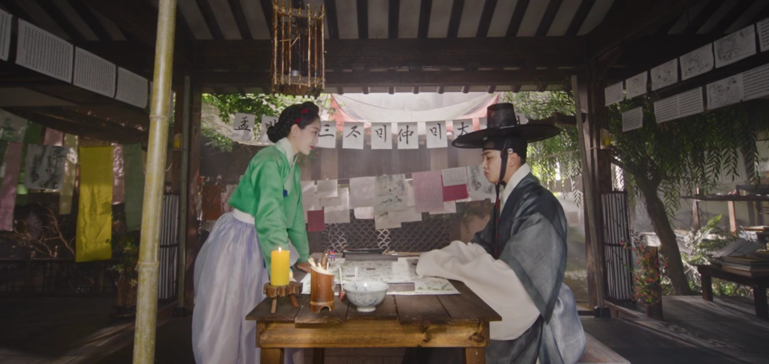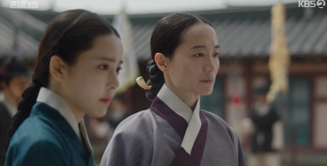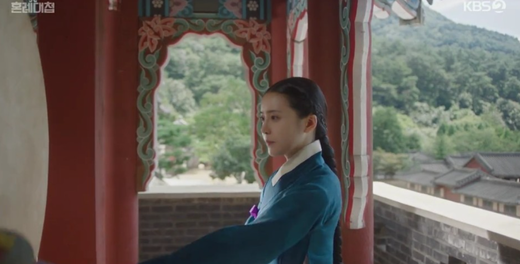 이후 둘은 세 자매에게 순덕의 첫눈맞기 필살기를 연습시키기 위해 맹박사댁으로 향합니다. 시범을 보이기 위해 정우가 서있는 도령역을 하고 순덕이 첫준맞기를 시범보이는데 순덕이 쓰개치마를 내리는 순간 정우가 심쿵하여 책을 떨어뜨리고 흉통을 느끼네요.