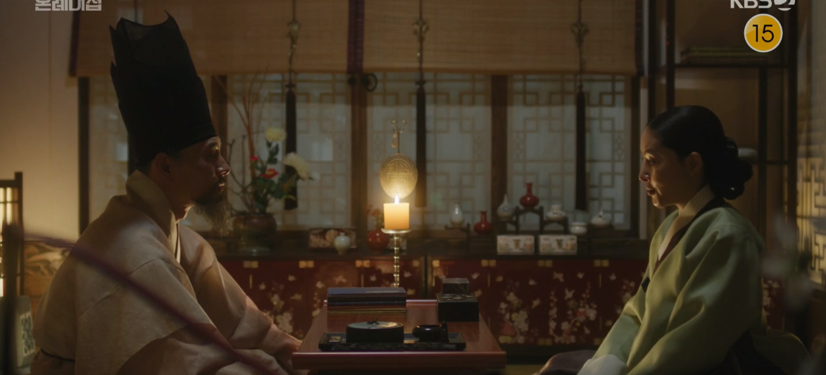 이후 박씨부인은 남편 좌의정 조영배대감에게 경운재 대감일을 의논합니다.  신문고 일과 맹박사댁 중매를 서는 일이 탐탁치 않은 조영배는 경운재 대감을 형의 뇌물수수혐의로 같이 엮어 유배를 보낼 계획이라고 하는데  박씨부인은 차라리 가까이에 두고 지켜보는 것이 좋겠다며, 순덕의 (입양)아들인 근석의 과외선생님으로 두자고 합니다.