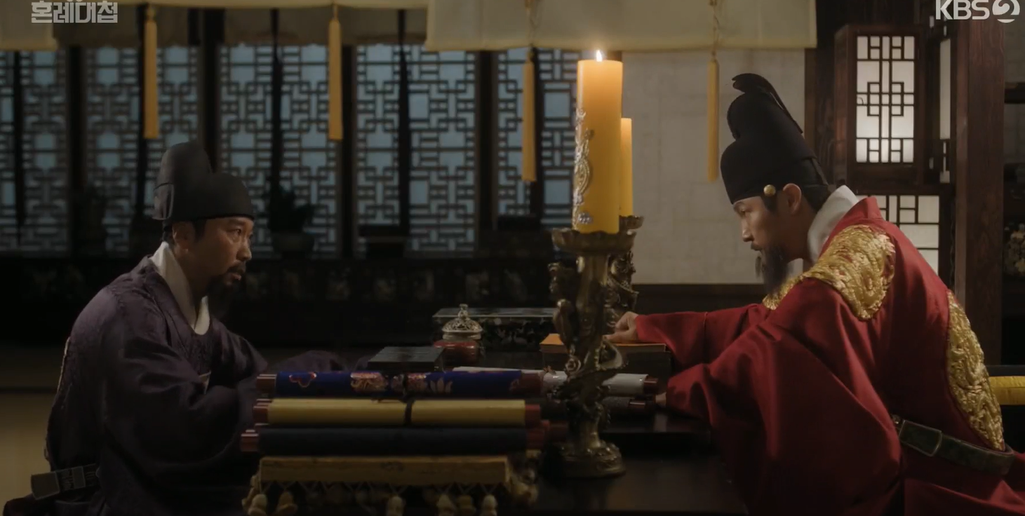 좌상은 소설의 거짓 이야기를 민심이라 여기면 안되다고 왕께 고하지만 왕은 소설때문이 아닌 병판이 관할지역에 사사로 금표(통행금지)를 치고 사사로이 이익을 취한 일로 파직을 시킵니다. 사실 이 내용은 세자가 사가에서 납치 되었을 때 하나와 산책을 하면서 알게 된 사실을 세자가 왕께 전했던 것이였습니다.