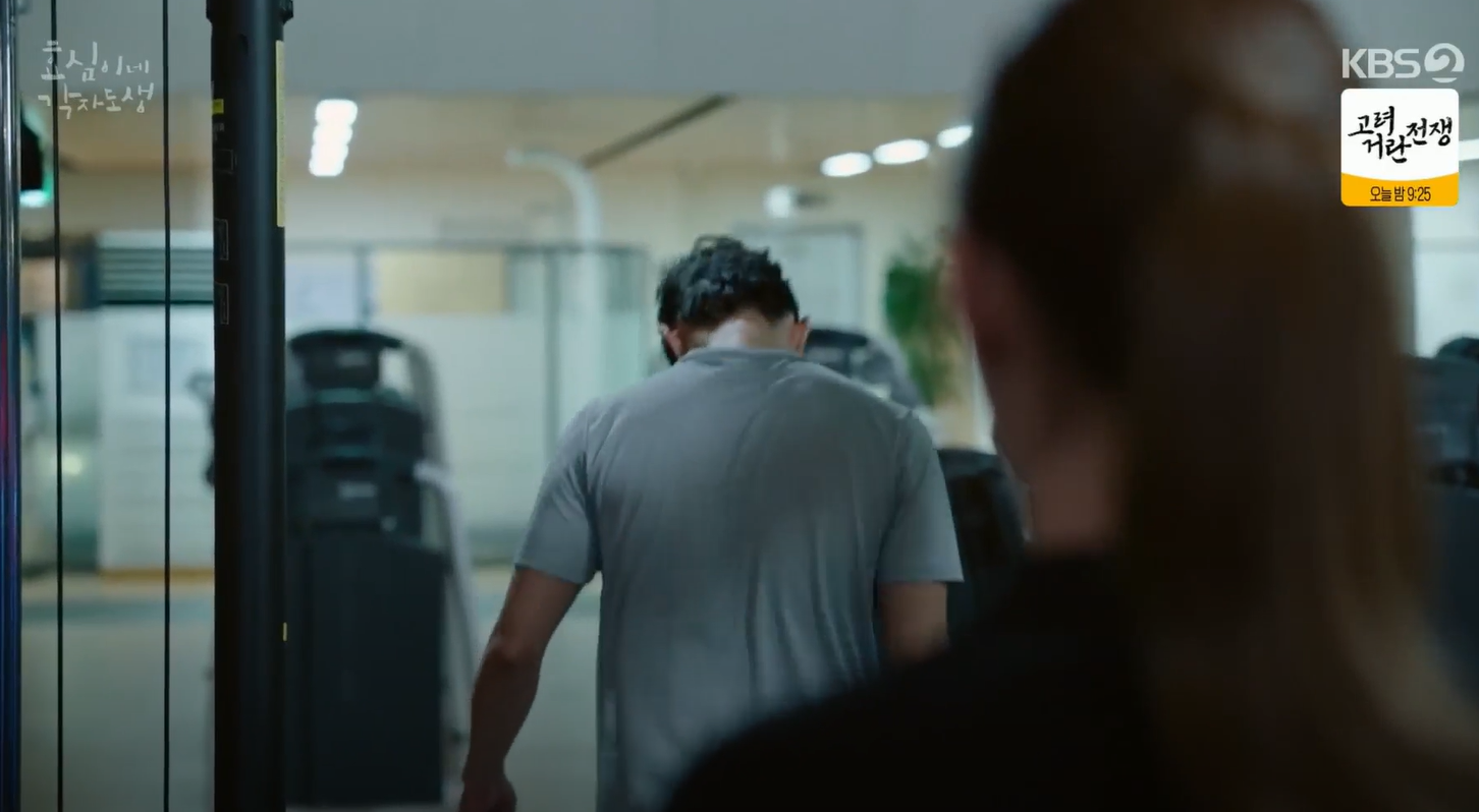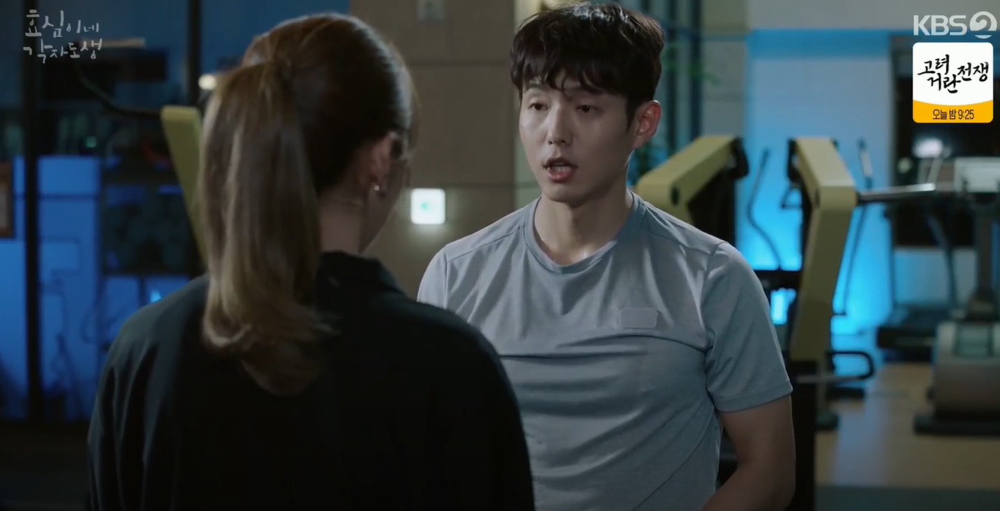 다음날 새벽PT시간. 거리를 두며 더 엄격하게 수업을 하는 효심때문에 태호는 아침부터 특수 훈련을 하듯 빡쎄게 운동을 하고 있습니다.