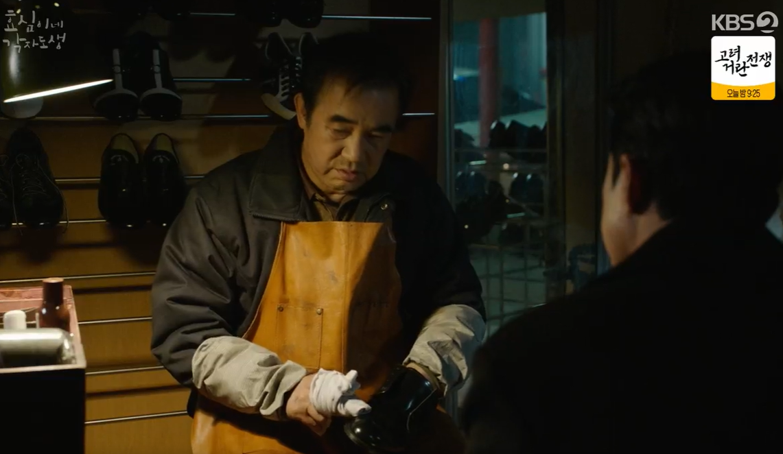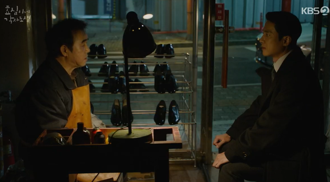안좋은 일 있을때마다 구두방에 가서 시간을 보내는 강진범. 자신은 그저 평범한 집안의 좋은 아빠이고 싶었다는 진범은 태민의 표정이 안좋자 무슨 일이냐고 묻고 태민은 여자문제라며 속내를 털어놓습니다. 가까운 사람과 같은여자를 좋아하는데, 다른사람과 달리 자신을 돈과 지위를 보지 않아서 좋다고 합니다.