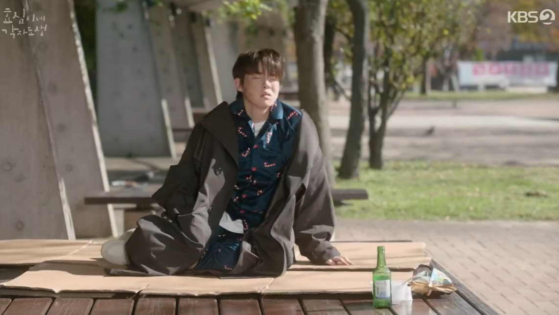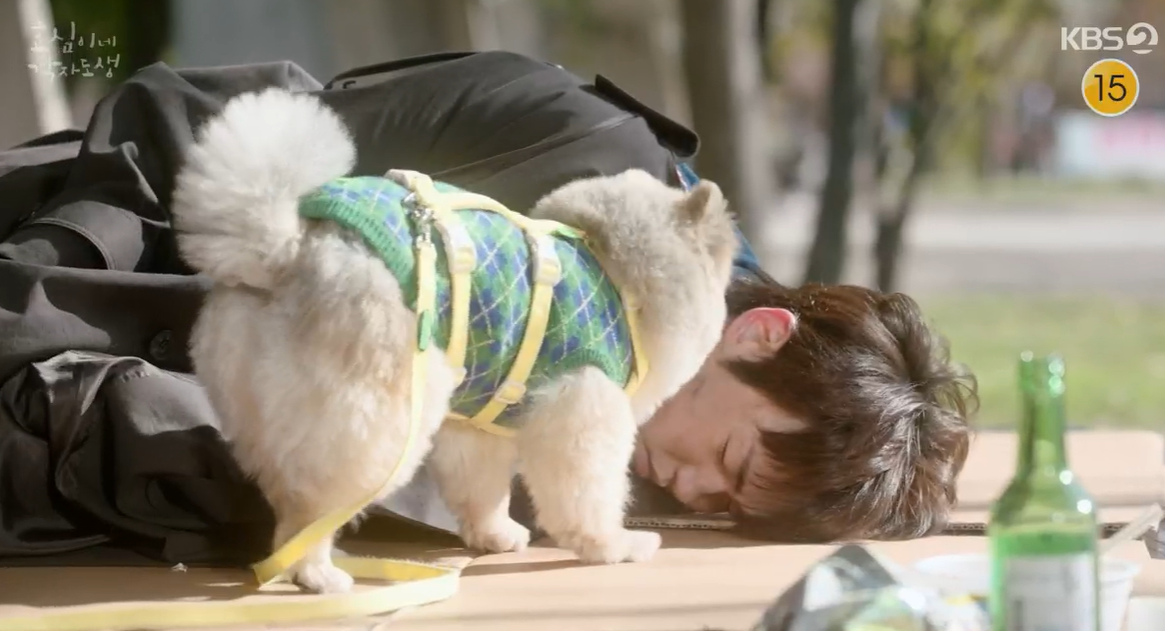 집을 나온 효도는 동네 강아지가 핥아 공원한복판에서 잠을 깨고 엄마 밥을 그리워 하지만 집으로 돌아가지 못하고 배회를 합니다.
