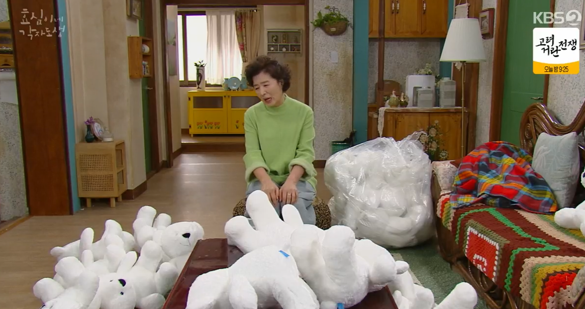 집에 혼자 있는 선순은 하루종일 요리해서 효준이 반찬 보내고, 이제는 또 인형 눈을 붙여야 하는 자신의 신세한탄을 하다가 하루종일 소식이 없는 끝순 소식을 궁금해 합니다.