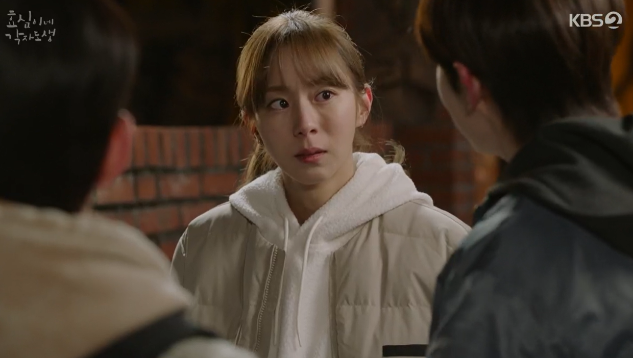 울면서 나가는데 가족회의에 소집된 효준을 만나는데, 다짜고짜 자신이 합격하고 나서 나가라고 말을 합니다.  자신의 독립과 효준 시험이 무슨 상관이냐고 묻자 자신이 신경이 쓰인다고 말하는 효준. 효심은 이제 더이상 오빠 뒷바라지 못한다며 알아서 잘 하라고 이야기면서 말씨름이 붙었는데 멀리서 효도가 달려와 싸움을 말립니다.