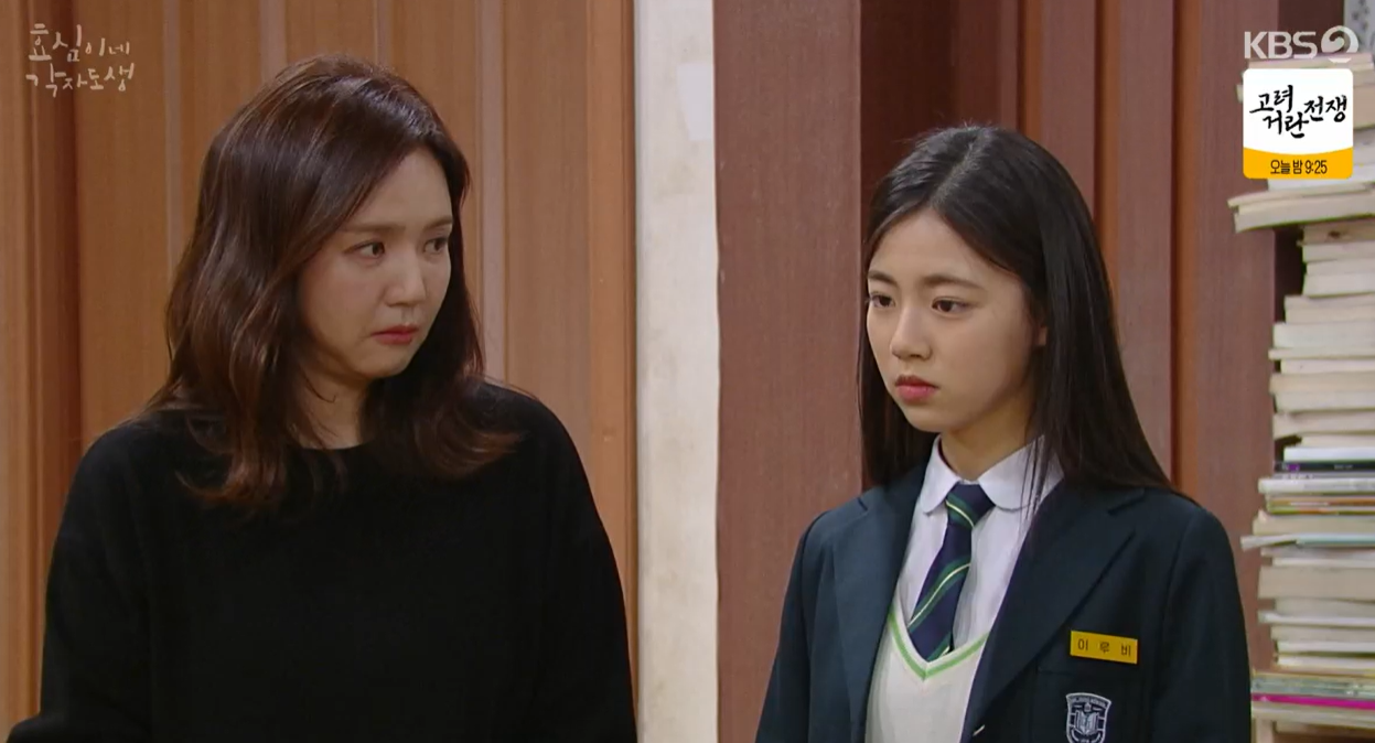 전날 효성과 자녀교육에 대해 진지하게 이야기 했던 희주는 루비를 설득해 아빠한테 사과하라고 데리고 나옵니다. 루비가 죄송하다고 하자 효성은 단지 이성문제 때문에 대든게 문제가 아니라고 이야기 합니다. 그러자 자신은 똑똑해서 자신에 대해서도 잘알고, 근본적인 문제도 잘 알고 있다고 따박따박 이야기 하고 효성은 그 모습을 보면서 할말을 잃습니다.