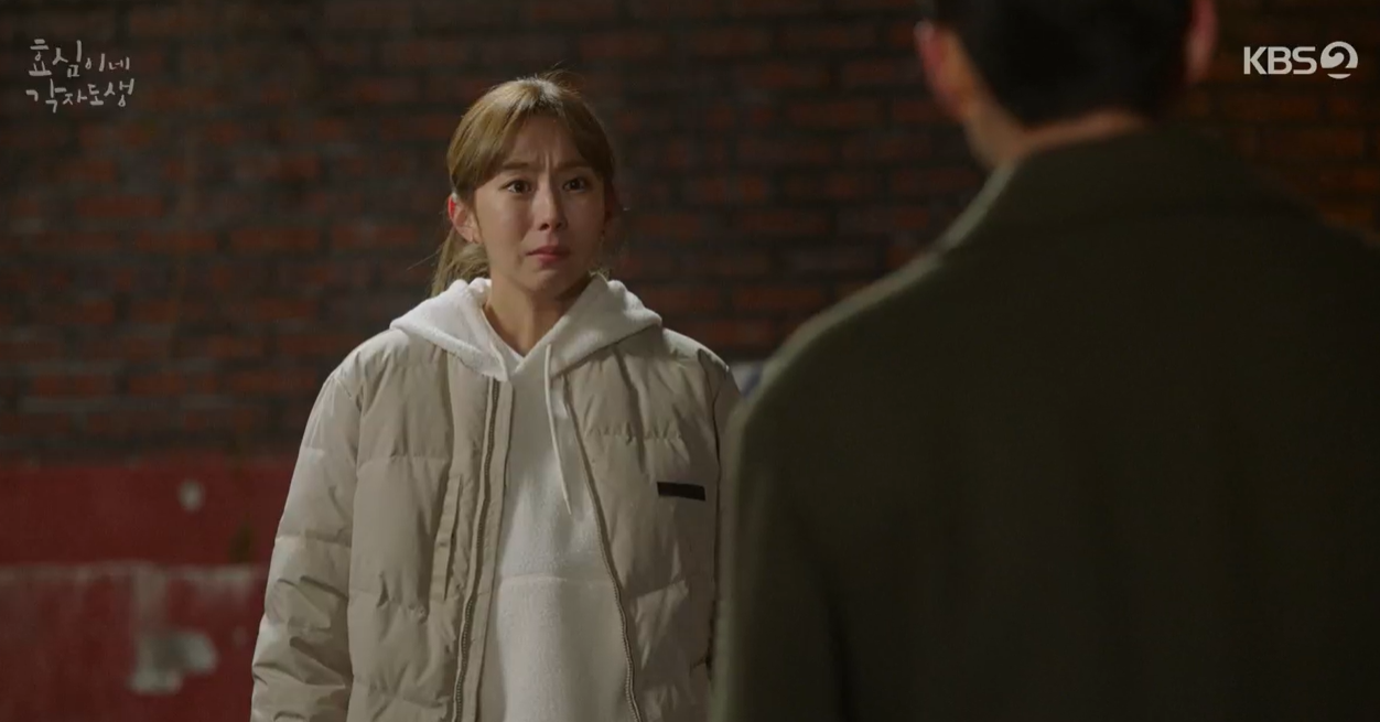 집 구해서 나갈 돌 있으면 보일러 고치게 돈을 달라고 말하는 엄마를 말없이 보던 효심은 엄마랑 형제들이랑 힘들다며 솔직히 털어놓자 형제들끼리 돕고 사는게 뭐가 그리 대단하고 힘든일이냐며 나갈거면 당장 나가라고 고래고래 소리지릅니다.