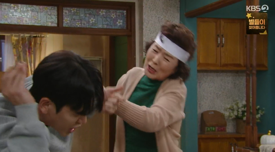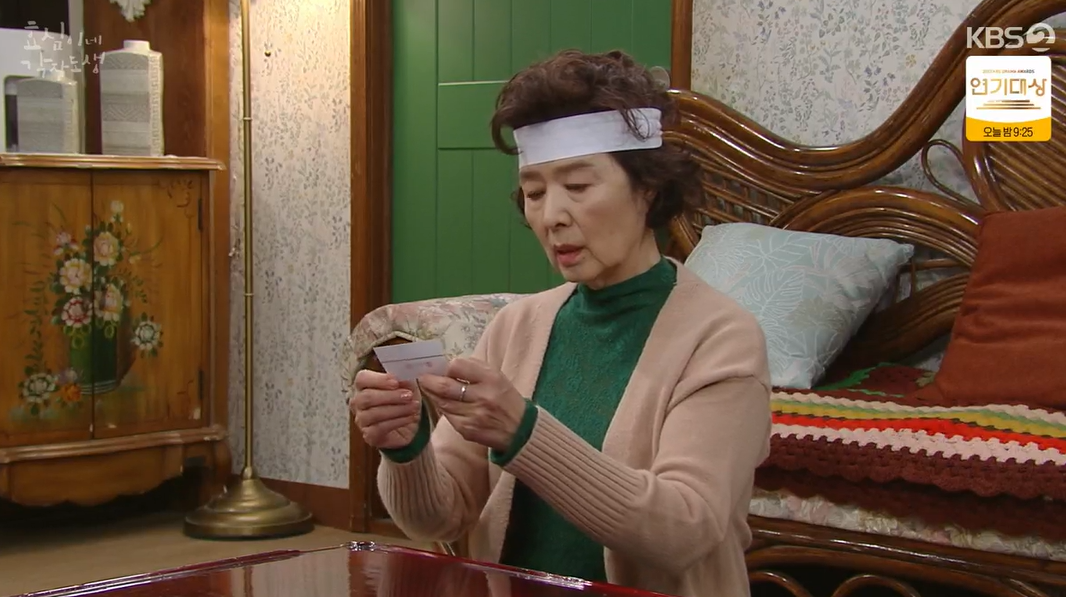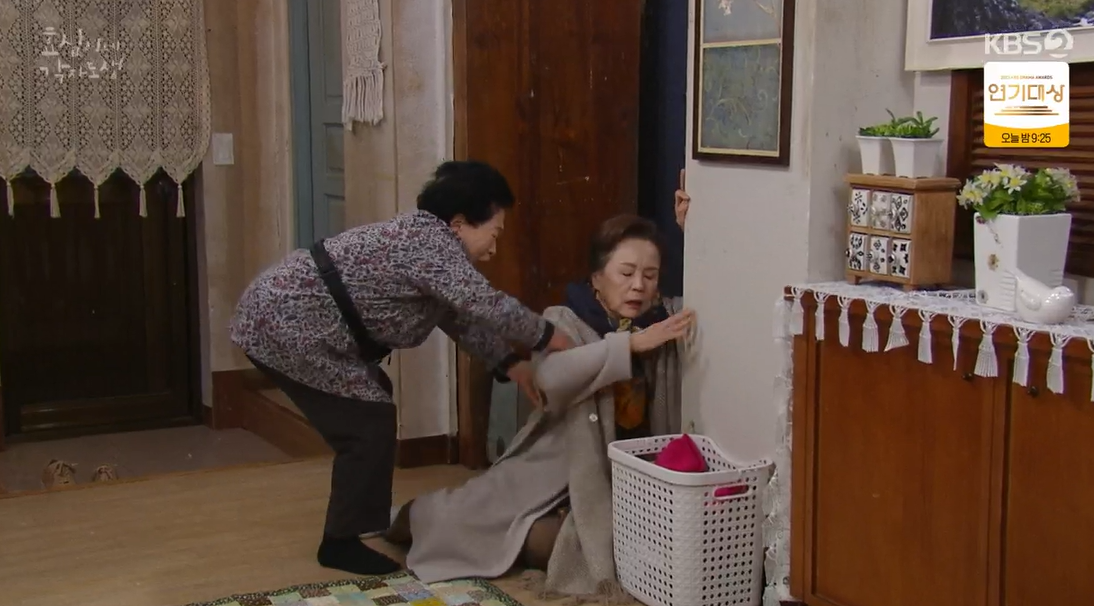 집에서 열렬히 가온을 응원하고 있던 끝순 할머니. 느즈막히 녹초가 되어서 집으로 돌아온 최명희가 쉬고 싶다며 끝순할머니한테 혼자 있고 싶다고 양해를 구하는데 급기야 다리에 힘이 풀려 주저앉아 버립니다. 그런 최명희가 걱정되는 끝순할머니는 선순에게 가서 녹두를 얻어다가 죽을 쒀주려 합니다.