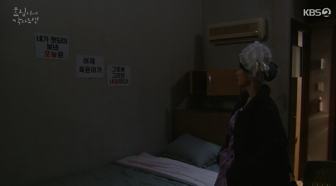 촬영을 마치고 분장한 채 돌아온 정미림은 고시원에 오자마자 효준의 방을 둘러보고 효준이 떠나버린 빈방에서 생각에 잠깁니다.