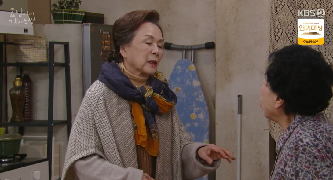 집에서 열렬히 가온을 응원하고 있던 끝순 할머니. 느즈막히 녹초가 되어서 집으로 돌아온 최명희가 쉬고 싶다며 끝순할머니한테 혼자 있고 싶다고 양해를 구하는데 급기야 다리에 힘이 풀려 주저앉아 버립니다. 그런 최명희가 걱정되는 끝순할머니는 선순에게 가서 녹두를 얻어다가 죽을 쒀주려 합니다.