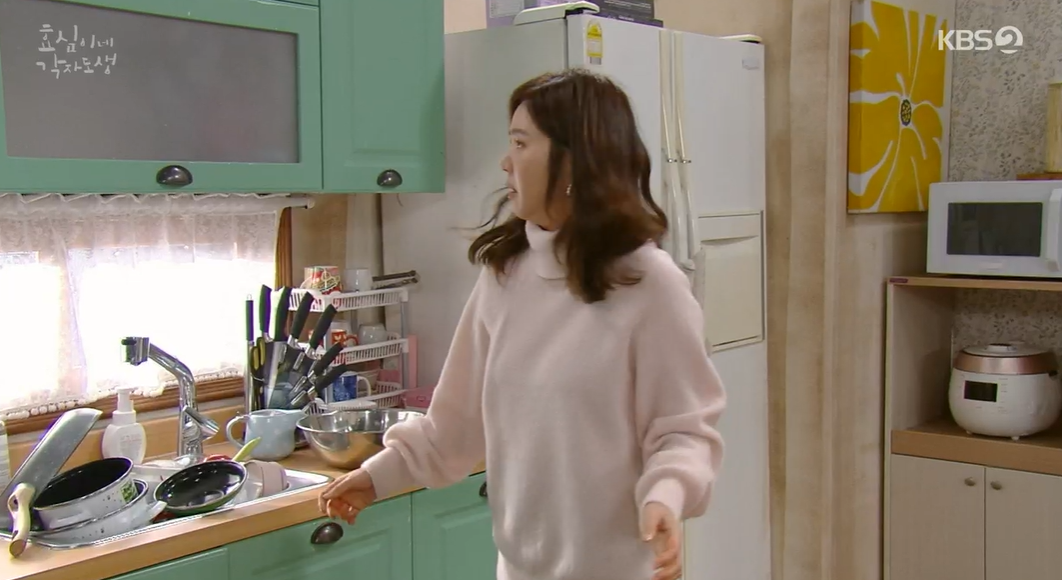 죽을 쒀와서 어머니 챙겨드리려는데 살림은 놓은 선순때문에 설겆이 거리가 산같이 쌓여있는 상황. 선순은 며느리에게 설거지 부터 하라며 일을 시킵니다.