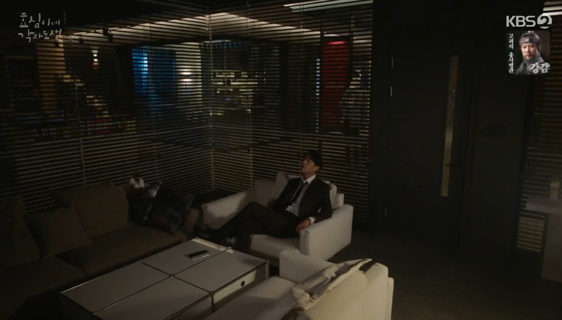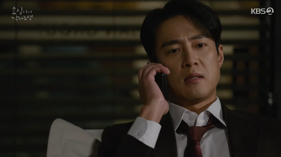 고민이 많지만 집에 가도 마음이 편치 않은 태민은 혼자 사무실에 남아 생각에 잠겨있는데 숙향이 전화를 걸어 진범이 또 술을 마시고 대관령 별장에서 난리를 치고 있다며 수습을 부탁합니다.