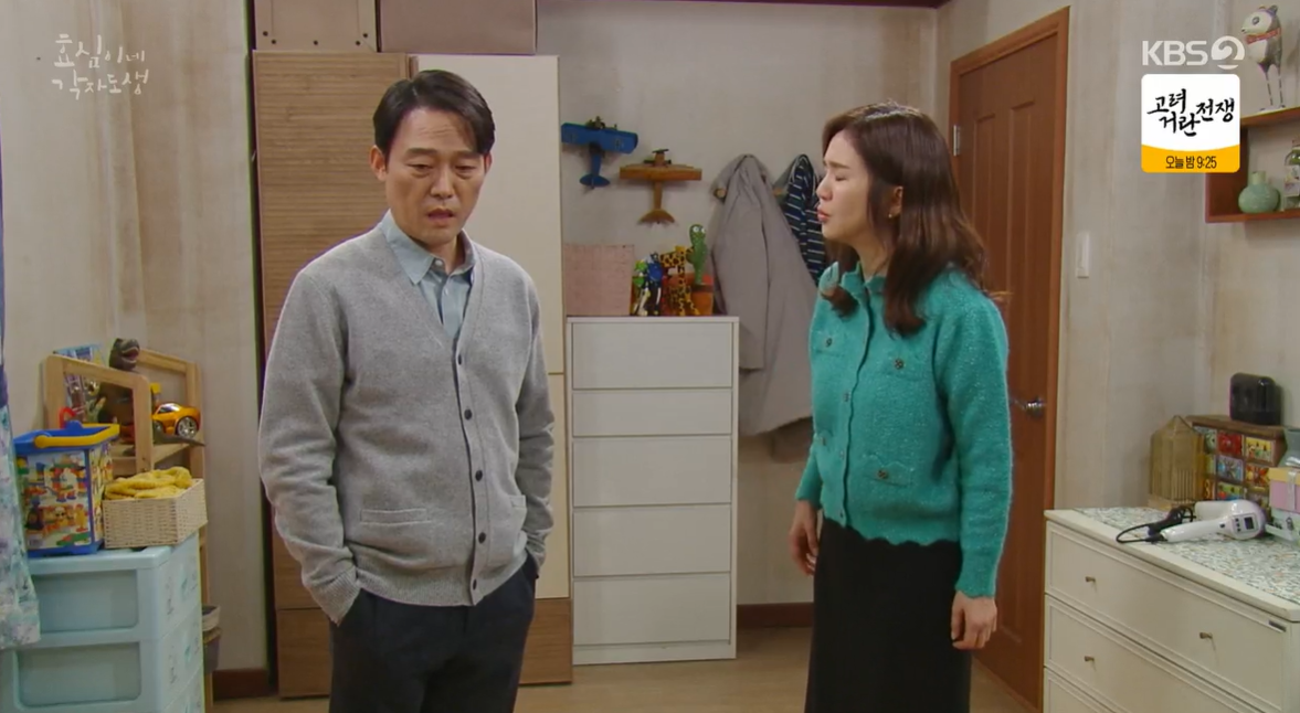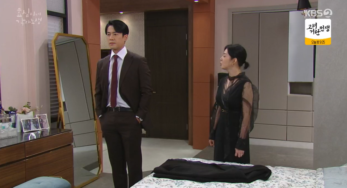 효준은 효심이 나간 후 상심에 빠져있는 어머니의 기분을 풀어드리기 위해 루비와 필립까지 동원해 어머니를 찾아뵙고 와서 아내 희주에게 어머님을 모시는 일에 대해 말을 꺼내 보지만 희주는 너무 힘들다며 반대를 합니다.