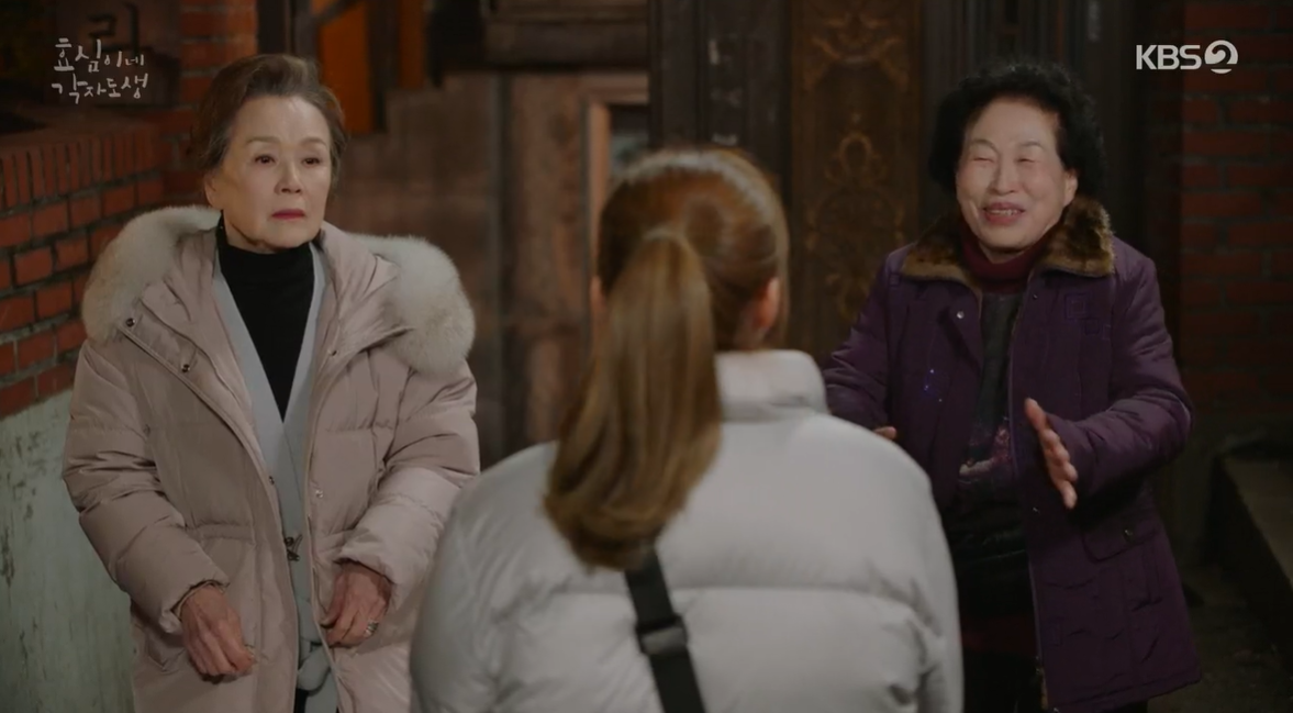 집으로 돌아온 효심은 할머님들과 마주치고 끝순할머니가 누구냐며 무슨일이냐고 묻지만 제대로 대답을 하지 못하고 안으로 들어갑니다.
