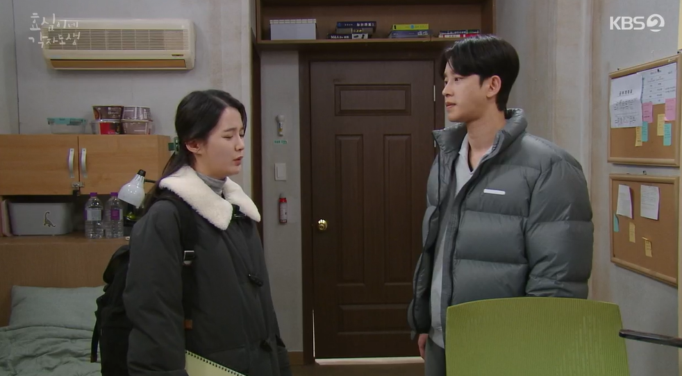 배우가 되고 싶은 꿈을 찾아 변호사도 그만두고 도전했던 정미림은 거듭된 오디션 탈락에 결국 포기의사를 밝히며 고시원을 떠납니다. 몇일 밤새워 쪽집게 노트를 만들었다며 효준에게 남은기간 준비 잘 하면 합격할 수 있을거라며 응원해주고는 떠나는 정미림.