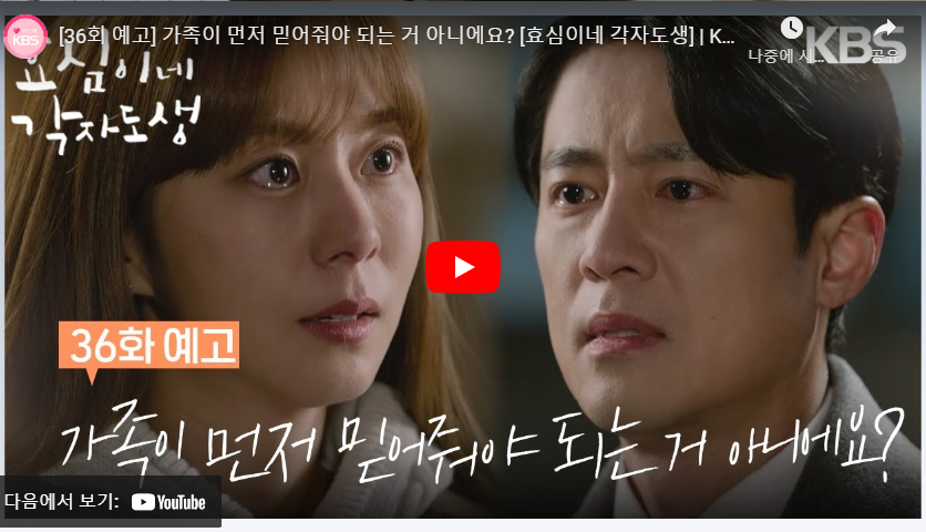 목차 효심이네 각자도생 34회 줄거리 명대사& 명장면 효심이네 각자도생 34회 줄거리 핵심요약 & 엔딩 하이라이트 1 ㄴ 등장인물 & 인물관계도 효심이네 각자도생 기본정보, 등장인물(출연진), 인