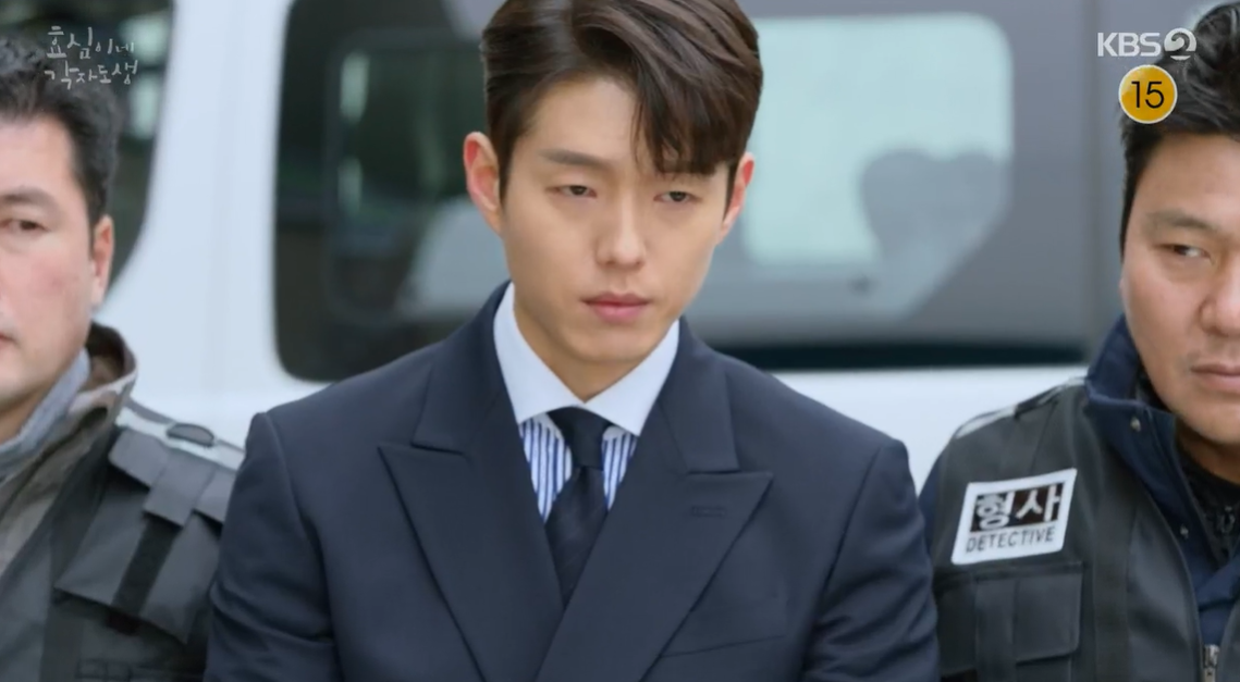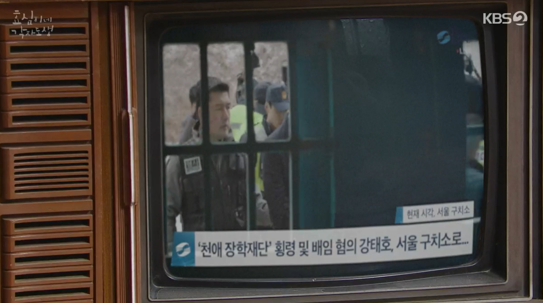 천애장학재단 관련하여 배임과 횡령, 불법적인 주식거래 혐의로 체포되는 태호.