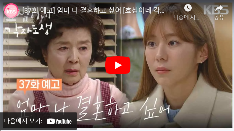 목차 효심이네 각자도생 37회 줄거리 명대사& 명장면 효심이네 각자도생 37회 줄거리 핵심요약 & 엔딩 ▶ 영상보기 [ [재회엔딩]"자주 가던 곳에 계신걸..." 결국 정영숙이 있는 곳을 찾아낸 고
