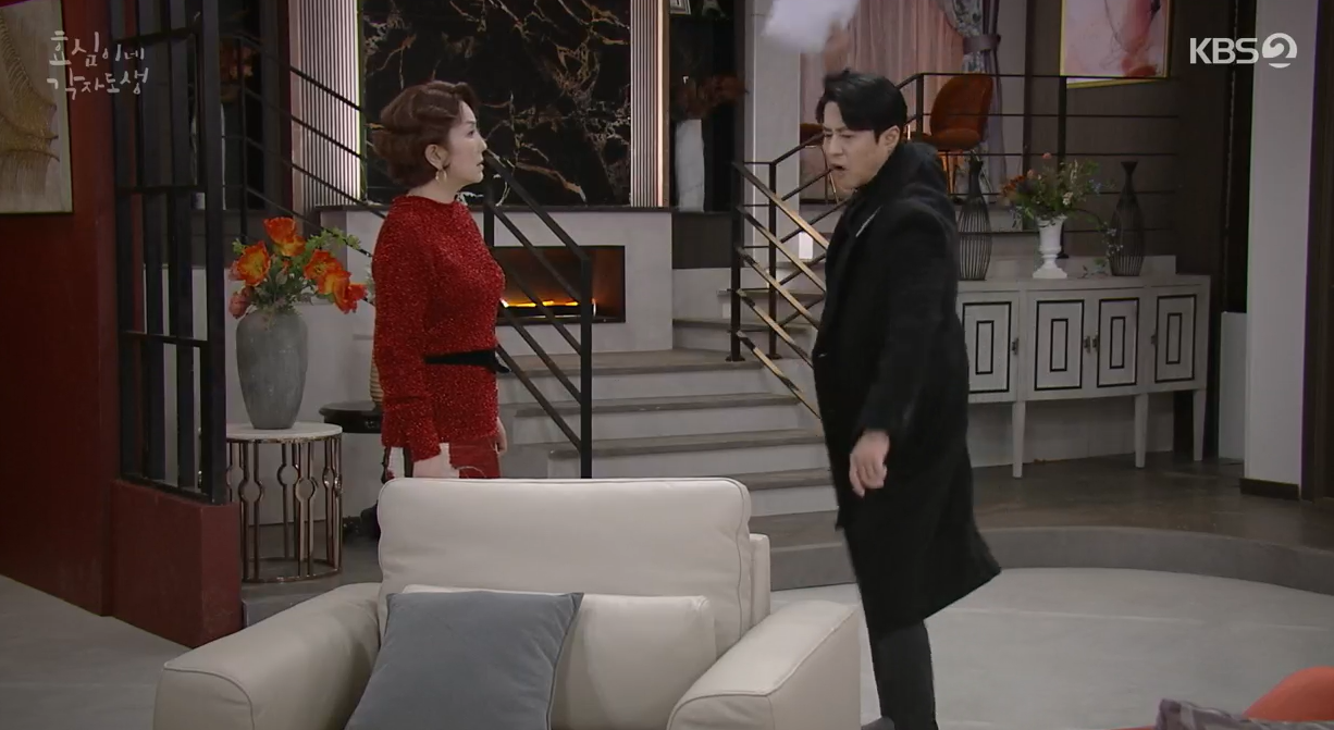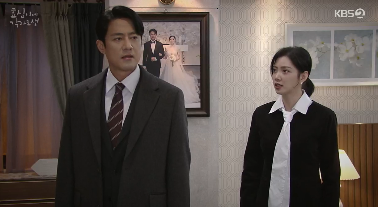 출근하는 척 양복을 입고 나가려는 효성에게 루비는 대놓고 잘렸나고 묻고 효성은 당황하면서 안짤렸다고 거짓말을 하고 집을 나섭니다.