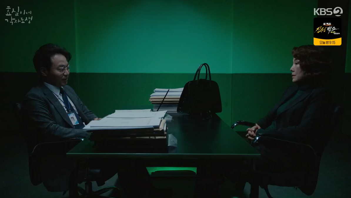 태호가 컨택했던 부장 검사한테 조사를 받고 있는 장숙향. 조사시간이 10시간이 넘어가고 있지만 모두 다 아니오, 상관없음, 모름으로 일관하고 있습니다.