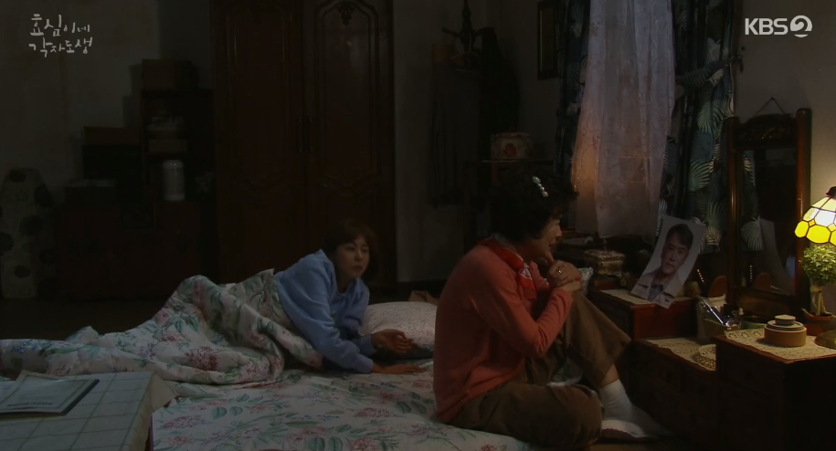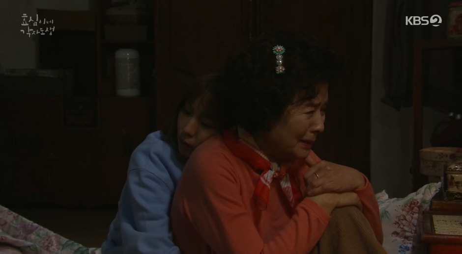 낮에는 속썩이는 자식들한테 역정내느라 기운을 차린 듯 했지만 깊은 밤 실종된 남편사진을 보면서 선순은 혼자 흐느끼고 잠이깬 효심이 속상해 하는 엄마를 꼭 안아 줍니다.