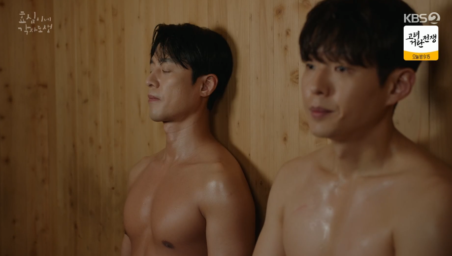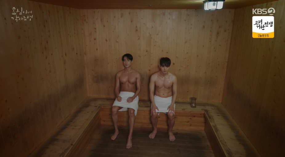 사우나에 따라가 함께 땀을 빼고 자신의 미국생활에 대한 이야기도 하면서 태호는 태민과 친해지려고 노력을 합니다.