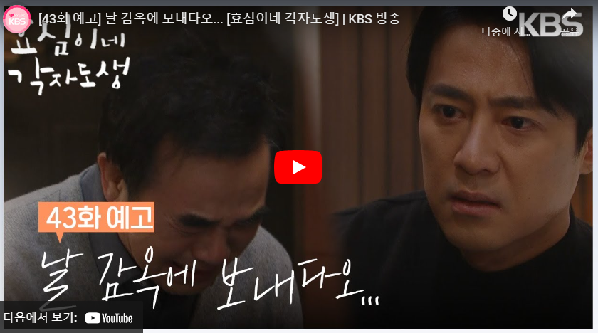 목차 효심이네 각자도생 43회 줄거리 명대사& 명장면 효심이네 각자도생 43회 줄거리 핵심요약 & 엔딩 ▶ 영상보기 [충격엔딩] "너무 겁이 났다" 고주원에게 말하는 대관령 사건의 진실, 듣고