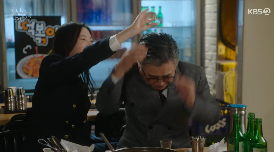 염전무와 술을 마시는 태희는 취한 염전무에게 아빠라고 부르며 러브샷을 합니다.