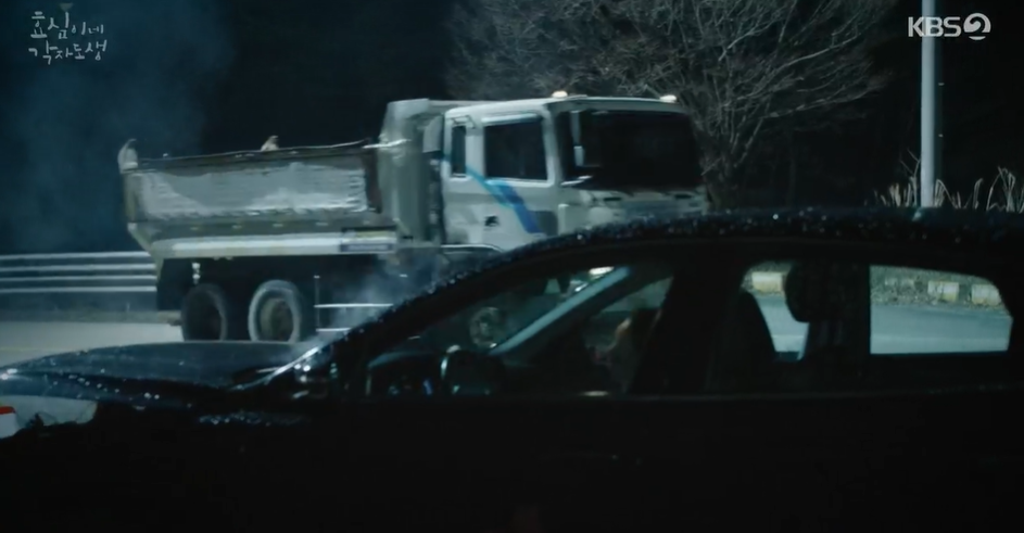 알고보니 진범의 차랑 부딪힌 후 겨우 멈춰있는 준범 부회장 부부의 차를 덤프트럭이 2차로 부짖혀 산밑으로 밀어버려 결국 차가 폭발하게 된 것이였습니다.