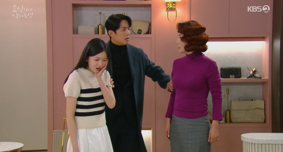 열받아서 유전자 검사를 하고 결과를 염전무 한테 보여준 태희한테 화풀이를 하는 숙향이 태희 뺨까지 때리자 태민이 나서서 말립니다.