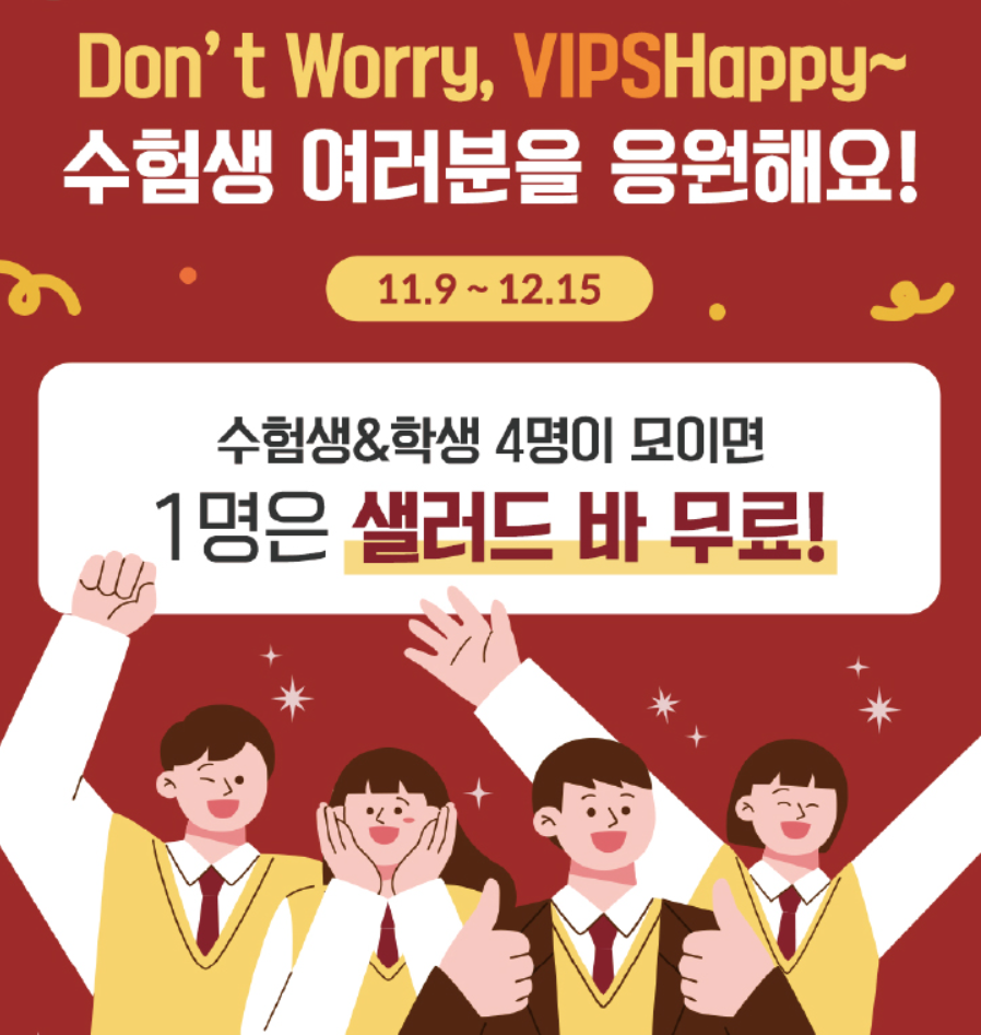 수험생 또는 청소년 1인 샐러드바 무료(수험생/청소년 동반 테이블 당 최대 1회)