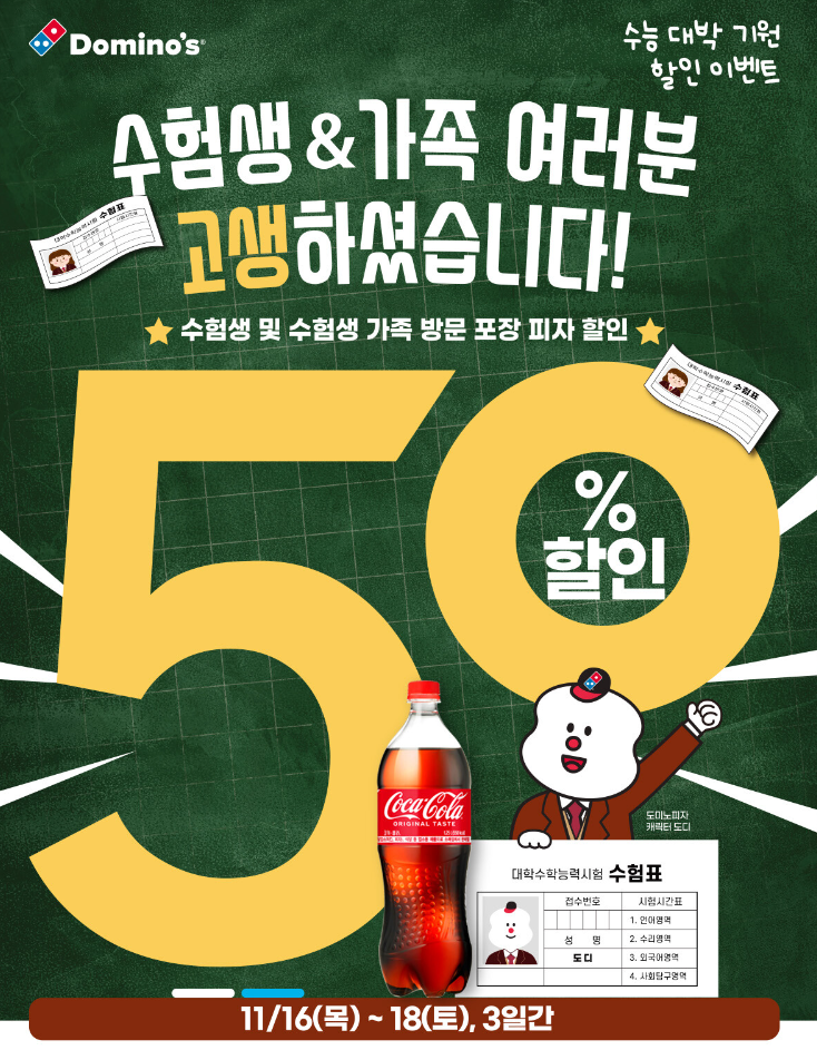 ▶ 도미노피자 <수험생&가족 포장 50%>
