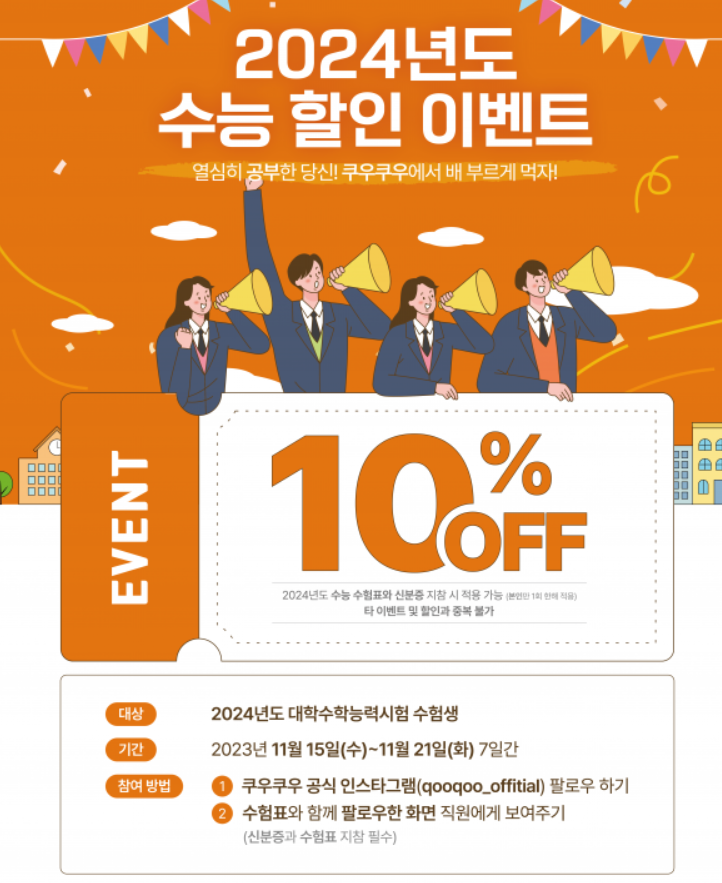 ▶ 방법:쿠우쿠우 공식 인스타그램(@qooqoo_official) 팔로우 하고 매장에서 수험표와 함께 팔로우 확인 화면 제시