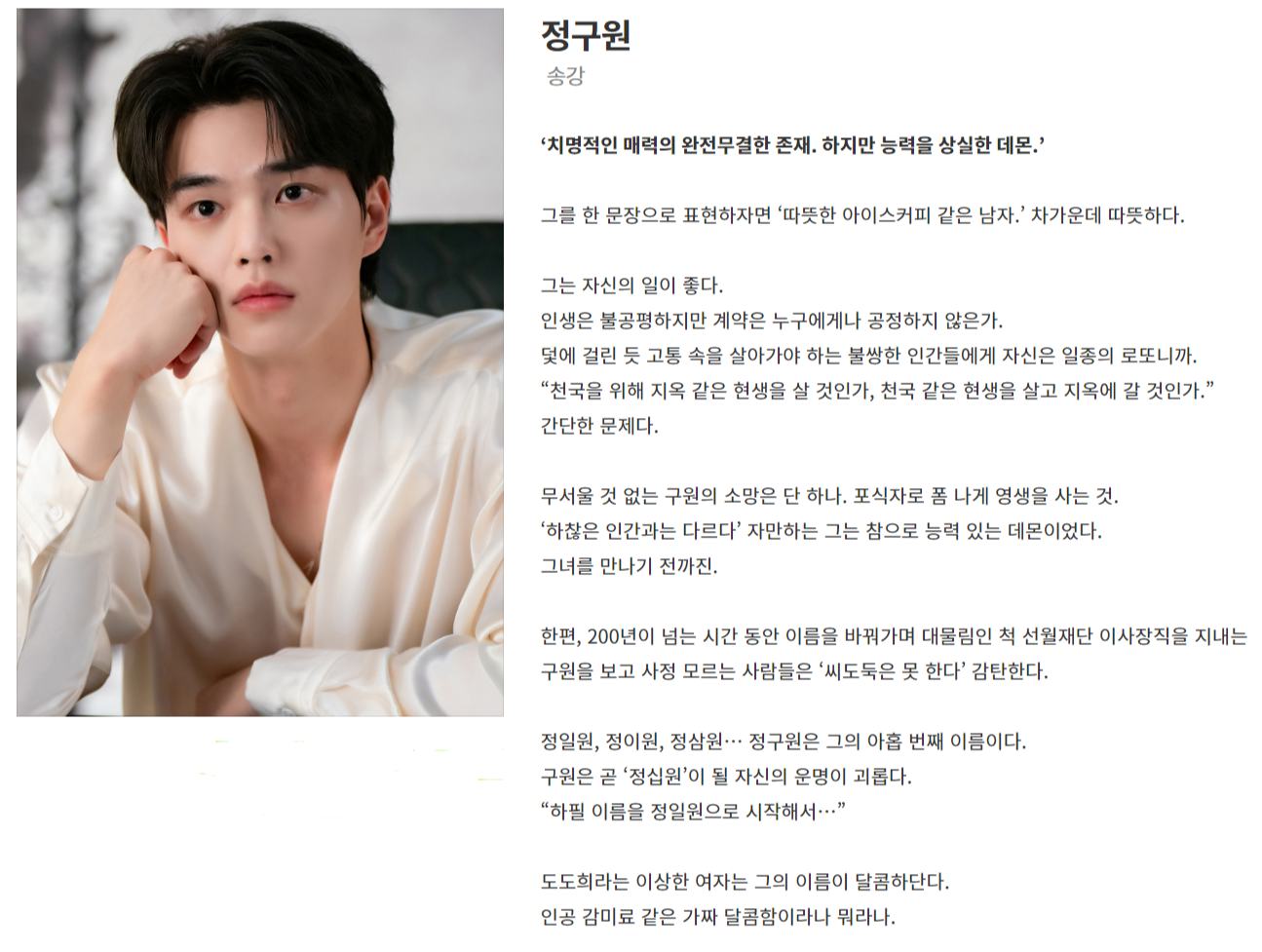 물에서 건져내자 마자 남자, 정구원은 자신의 타투를 가겨갔다고 난리. 알고보니 남자의 정체는 바로 200년을 넘게 영생하며 살아온 데몬(악마) 이였던것. 그러나 도도희에게 타투를 뺐기며 능력을 상실하게 됩니다.