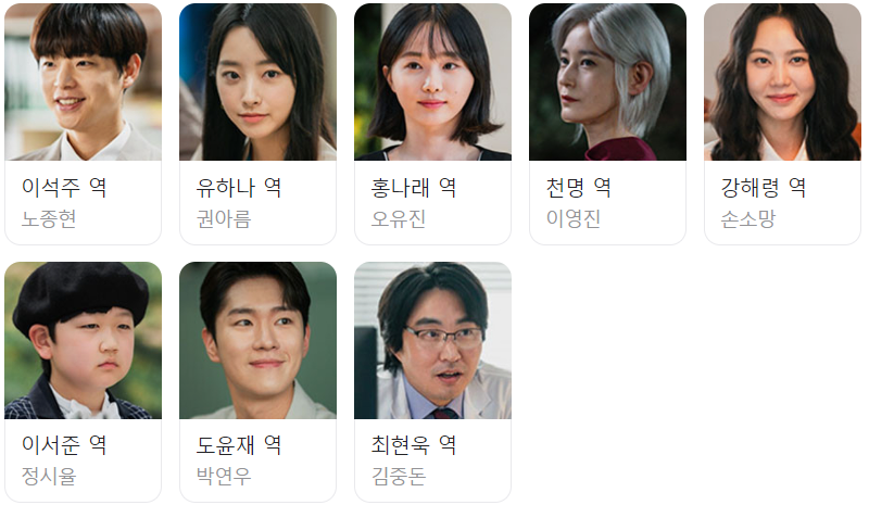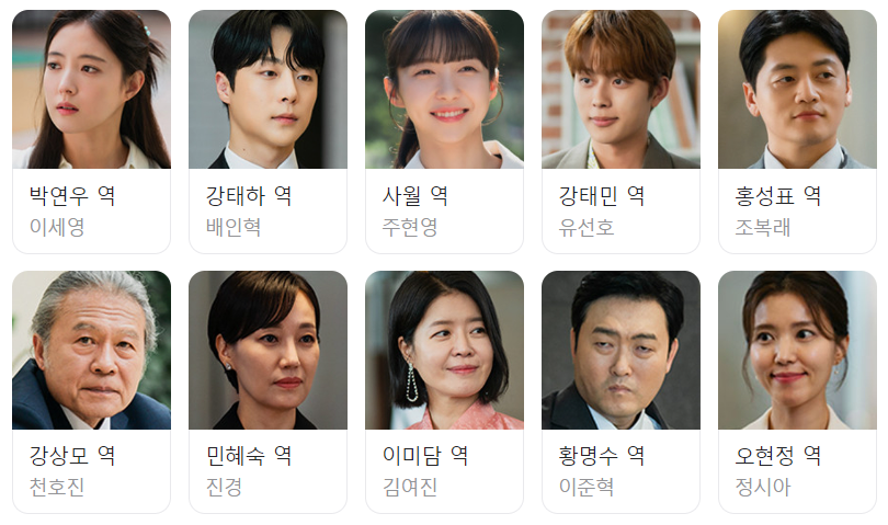 박연우 (이세영), 강태하 (배인혁), 사월 (주현영), 강태민 (유선호), 홍성표 (조복래), 강상모 (천호진), 민혜숙 (진경), 이미담 (김여진), 황명수 (이준혁), 오현정 (정시아), 이석주 (노종현), 유하나 (권아름), 홍나래 (오유진), 천명 (이영진), 강해령 (손소망), 이서준 (정시율), 도윤재 (박연우), 최현욱 (김중돈) 외
